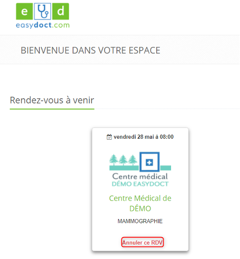 – Ou via le lien d’annulation envoyé par EasyDoct dans votre e-mail de confirmation ou de rappel de rendez-vous.